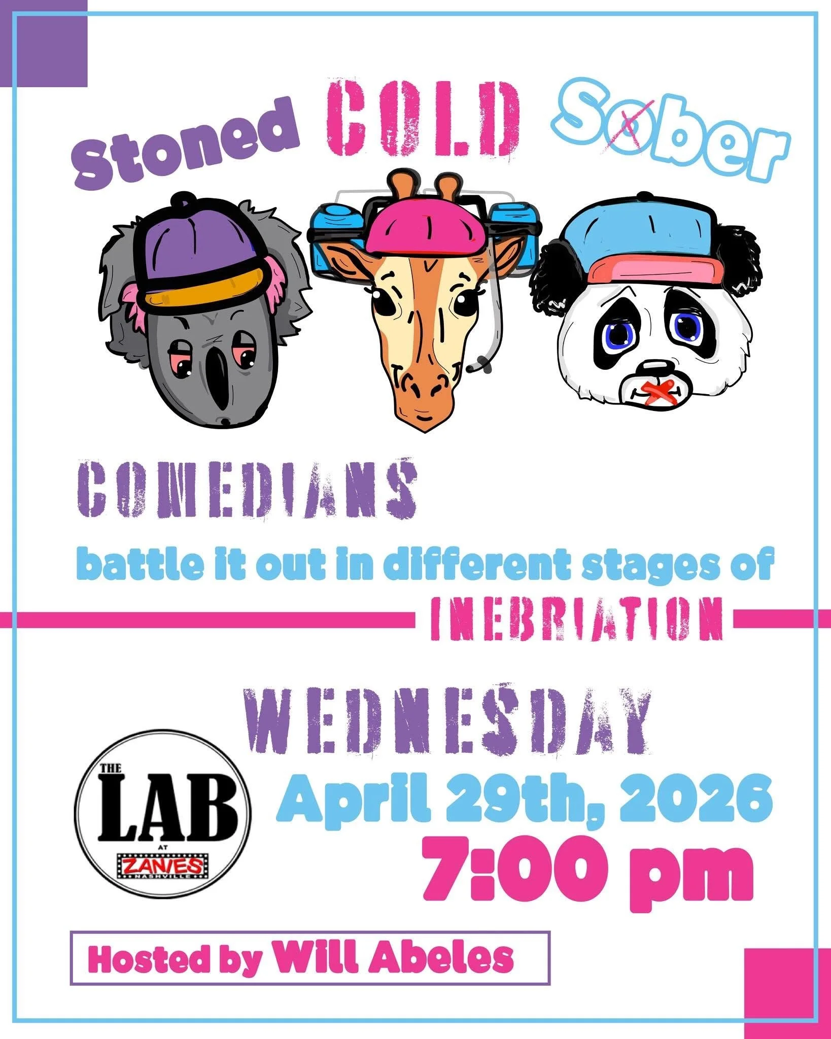 Stoned Colder Sober is a stand-up comedy competition where comics go head to head while in different states of inebriation. Two sober, two stoned and two drunk comedians battle it out and you, the audience, get to vote and decide who your favorite comic was from each round. Hosted by Will Abeles, Stoned Cold Sober features some of Nashville’s best local and nationally touring comedians so come grab a drink, hit your vape and come ready to laugh at Stoned Cold Sober!